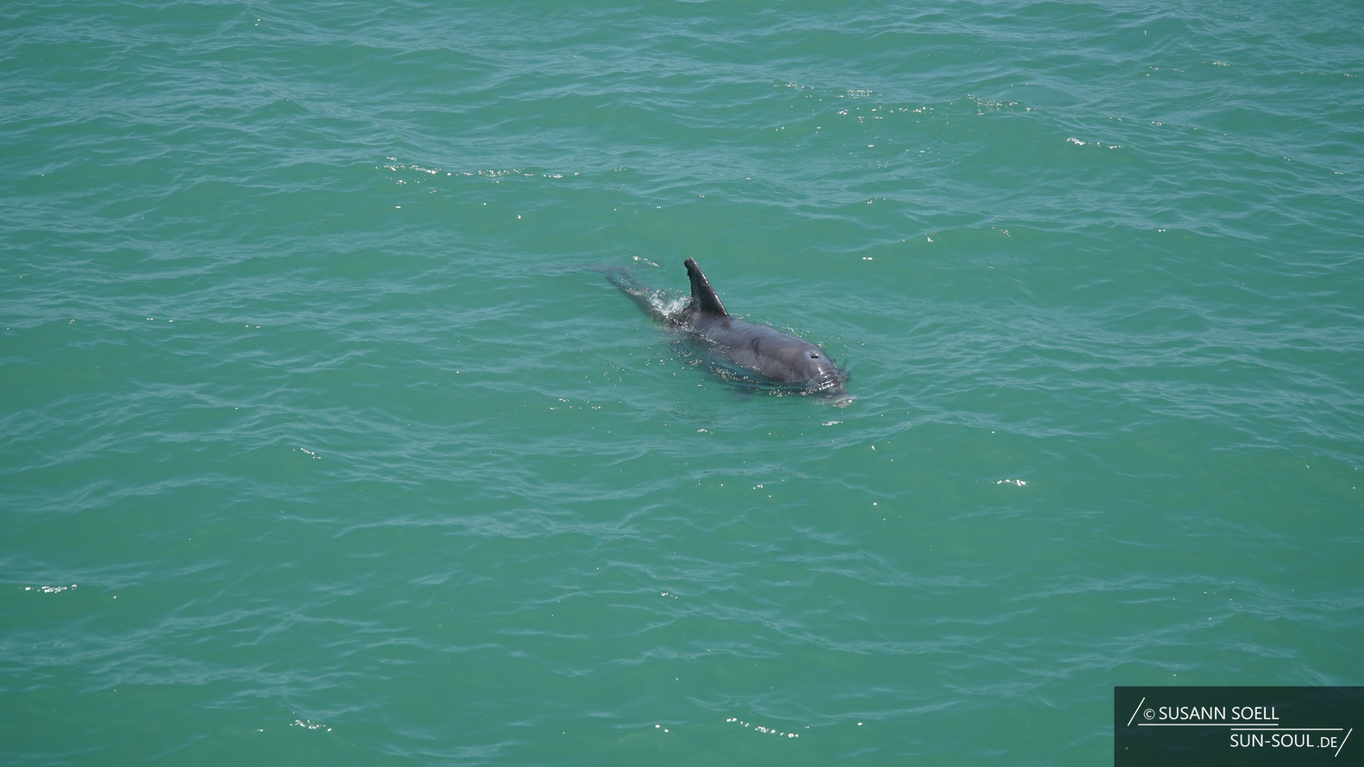 Wir laufen den Pier entlang und schauen den Anglern beim Fischen zu. Als wir plötzlich unseren Augen nicht trauen. Im Wasser schwimmen seelenruhig Delfine umher. Mal schaut nur ihre Rückenflosse aus dem Wasser, mal zeigen sie sogar ihre langgezogene Schnauze. Es scheint, als gäbe es für sie keinen schöneren Ort zum Schwimmen als hier.