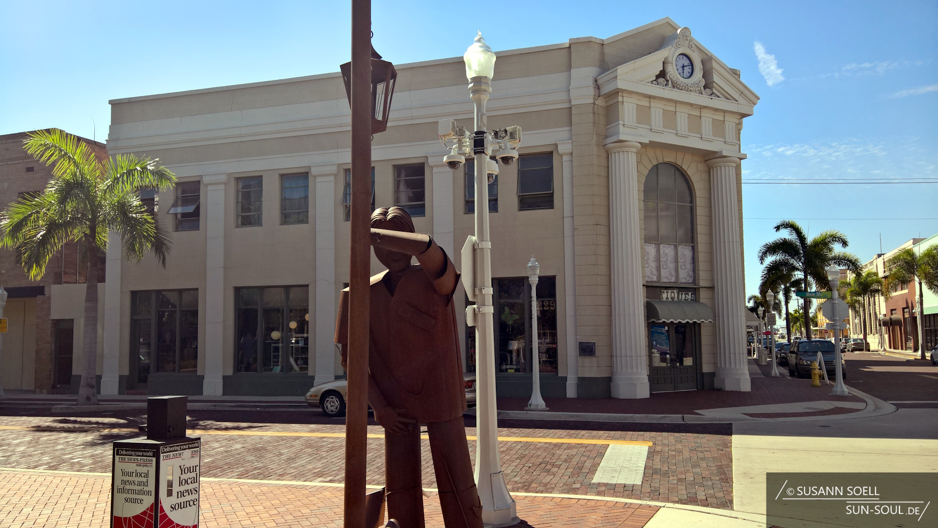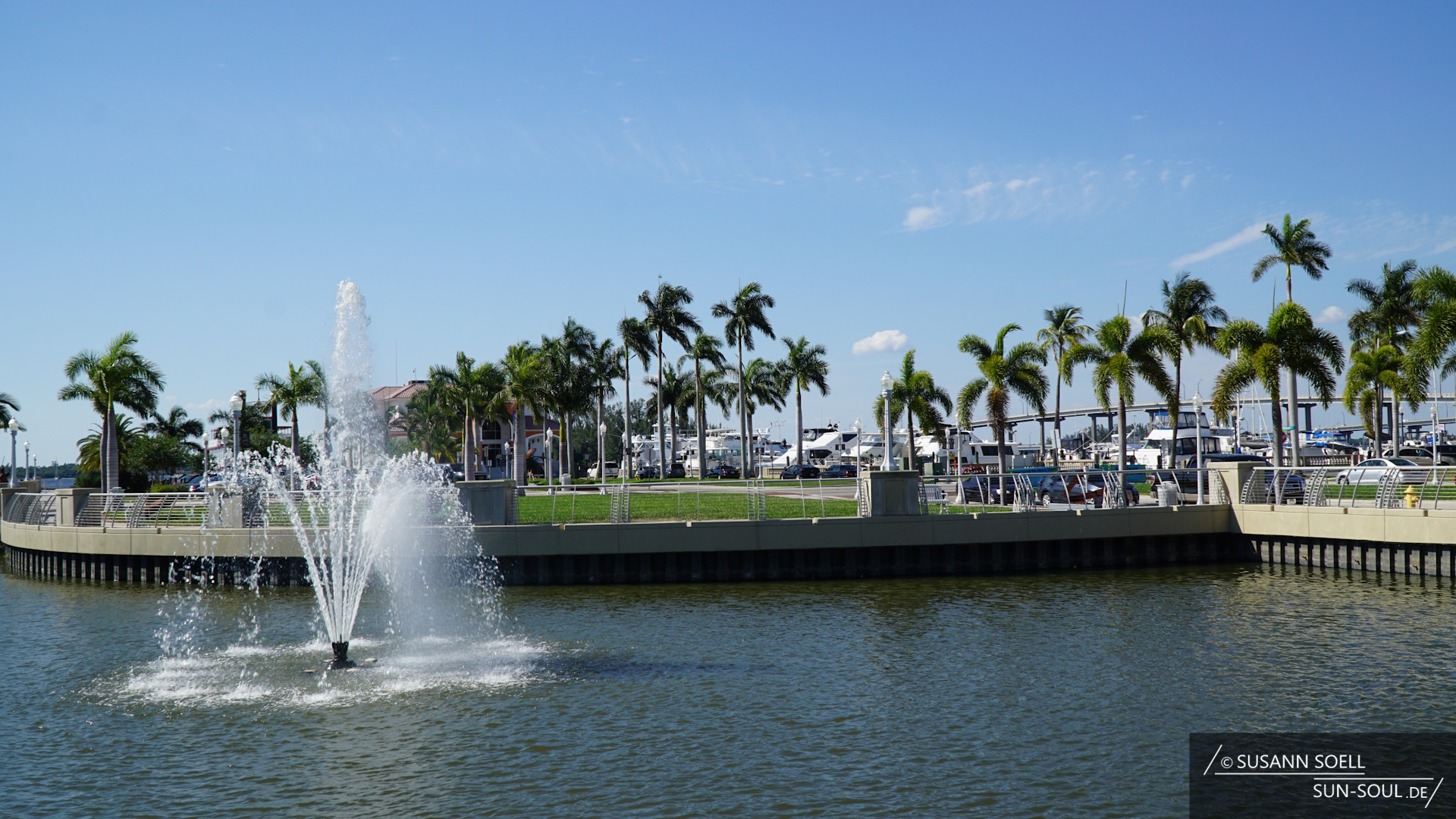 Wir begeben uns, wie so oft, abseits des Mainstreams und fahren zum Centennial Park. Nachdem wir einen Parkplatz gefunden haben, laufen wir zum Wasser und den Edwards Drive entlang. Die rot gepflasterte, menschenleere Straße ist gesäumt von Palmen und verläuft zwischen den zwei Brücken Caloosahatchee Bridge und Edison Bridge. Die Gegend ist wunderschön angelegt: Springbrunnen, Kunstskulpturen, Grünflächen und Backsteingebäude. Dazwischen immer wieder der Blick auf den in der Sonne glitzernden Caloosahatchee River und die sich am kleinen Hafen tummelnden Boote.