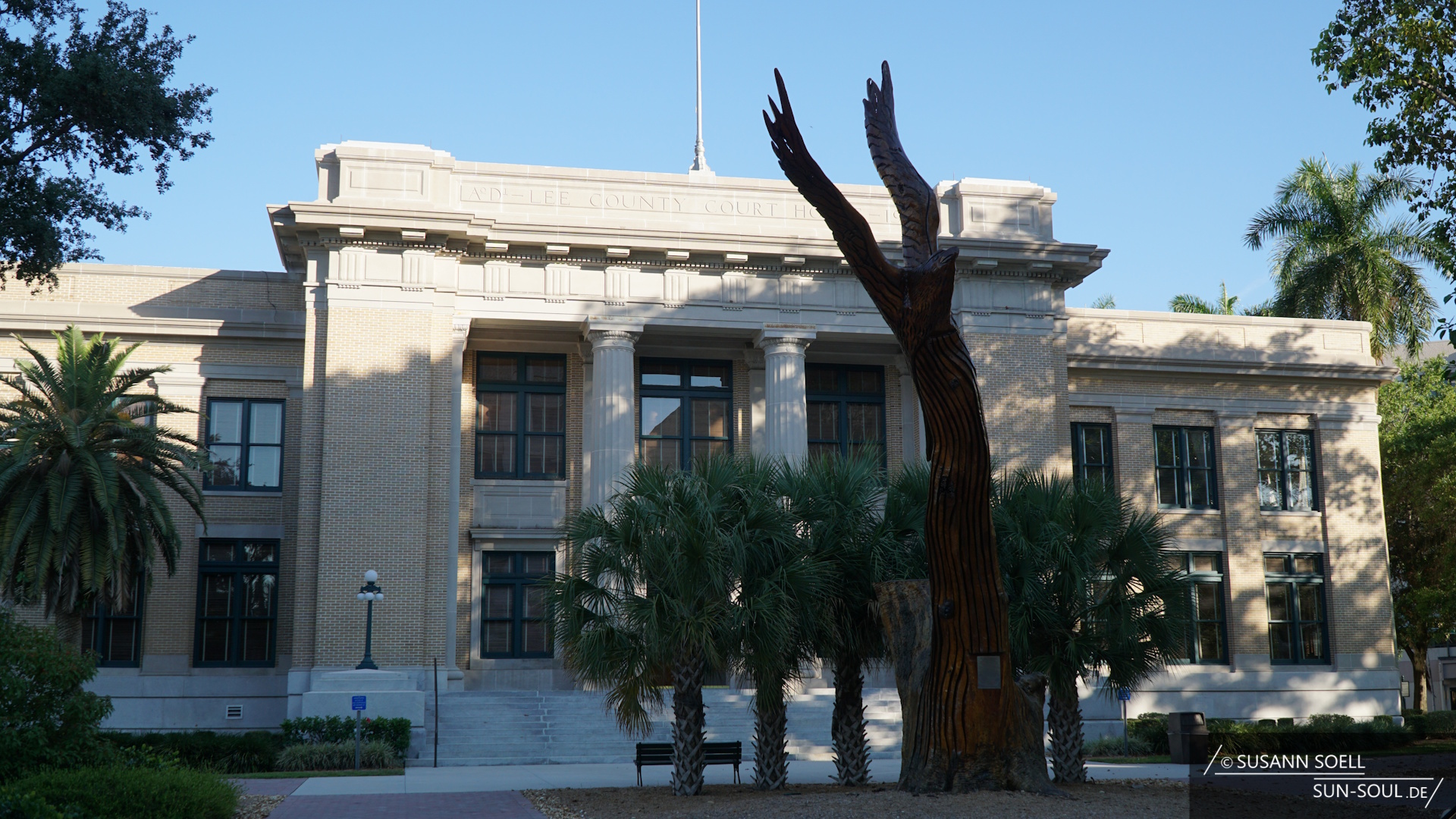 - Old Lee County Court House: Zusammen mit dem etwa 1,75 Hektar großen, umliegenden Gelände bildet das 1916 im klassizistischen Stil erbaute Gebäude das Zentrum der Kreisverwaltung von Lee County. Aus der alten Eiche, die sich vor dem Eingang befindet und in den 1800er Jahren gepflanzt wurde, wurde eine beeindruckende Adlerfigur geschnitzt. Im Schatten liegende Bänke laden zum Verweilen und zum Bestaunen des riesigen, vermutlich in den 1920er Jahren gepflanzten Banyan-Baumes ein.[7]