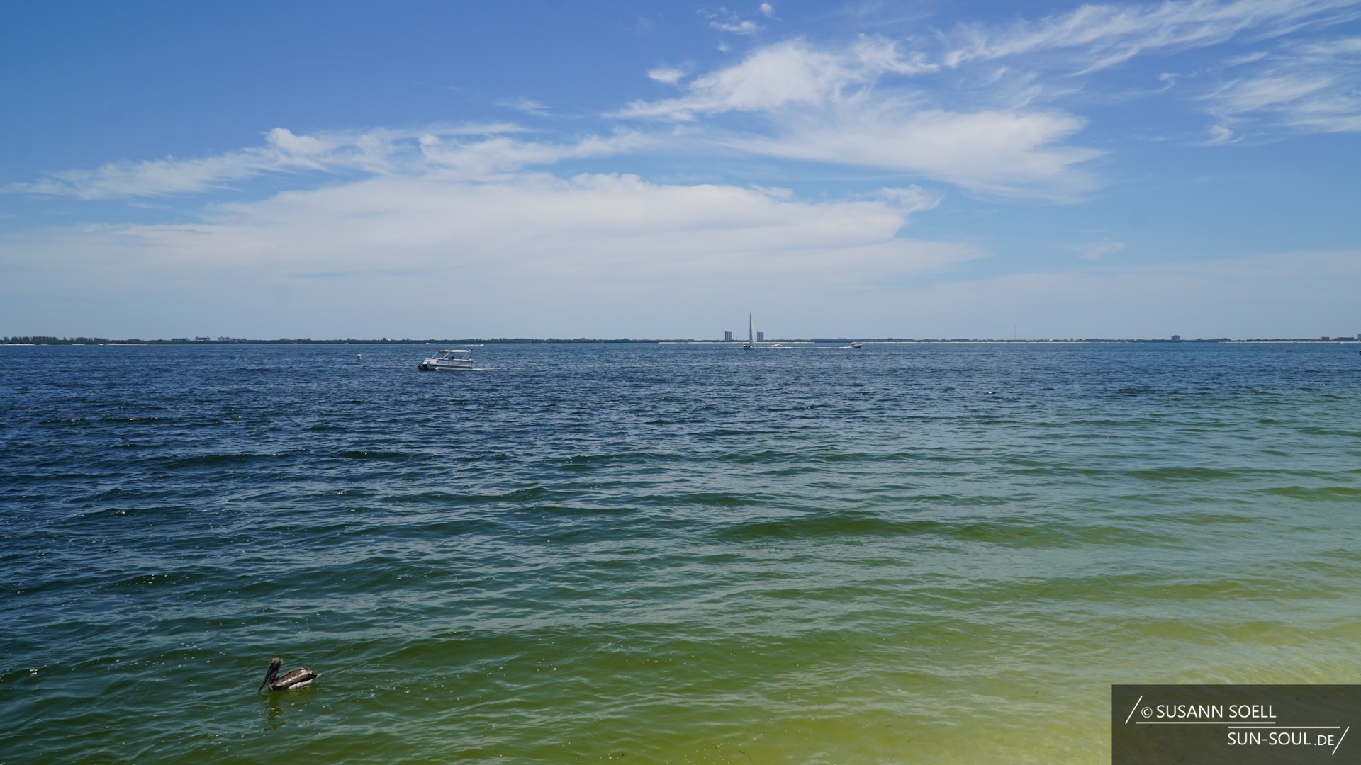 Der Fahrradweg verläuft baulich getrennt neben der Verkehrsstraße. Nach etwa 5 Minuten verzweigen sich links und rechts des Weges Wasserstraßen, die von Palmen gesäumt sind und einen direkten Blick auf die dahinter liegenden Wohnhäuser verhindern. Über die ein oder andere Brücke gelangen wir schließlich zum Fishing Pier des Sanibel Island Northern Beach und legen dort eine kurze Pause ein. Wir beobachten die Leute bei ihrer Lieblingsbeschäftigung, dem Angeln, und die Pelikane bei ihrer Futtersuche. Die Brücke des Sanibel Causeways wieder im Rücken fahren wir in die andere Richtung der Insel.