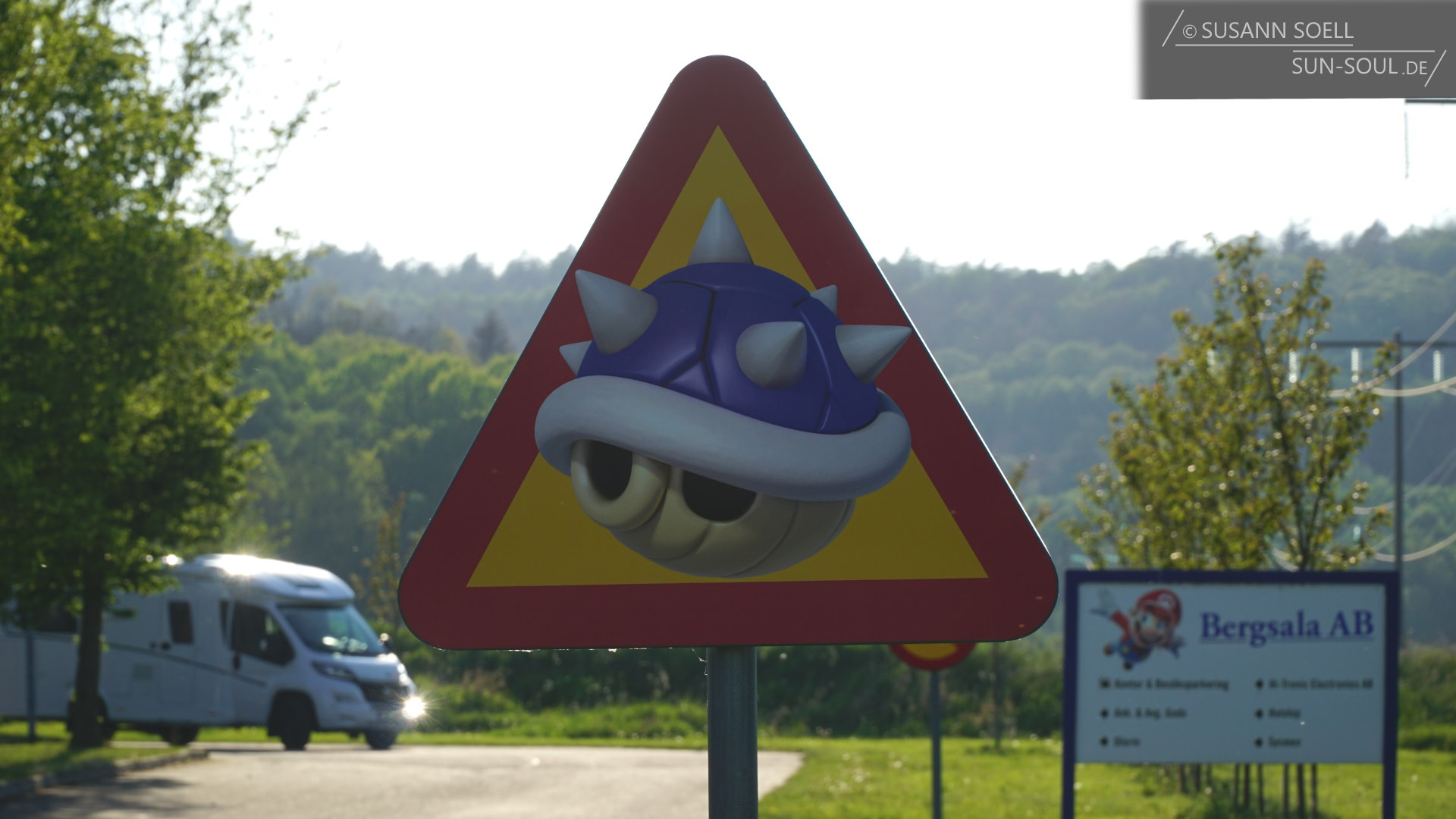 Und da ist er: der meterhohe, grüne Schornstein. Ich habe mich also wirklich nicht geirrt. Völlig verblüfft und fasziniert zugleich fahren wir auf das Gelände von Bergsala AB, einer schwedischen Geschäftsstelle von Nintendo (Marios gata 21, 43437 Kungsbacka). Wir trauen unseren Augen nicht, als uns Mario und der blaue Panzer von Koopa bereits bei der Einfahrt auf Vorfahrts- und Zebrastreifenschildern „begrüßen“.