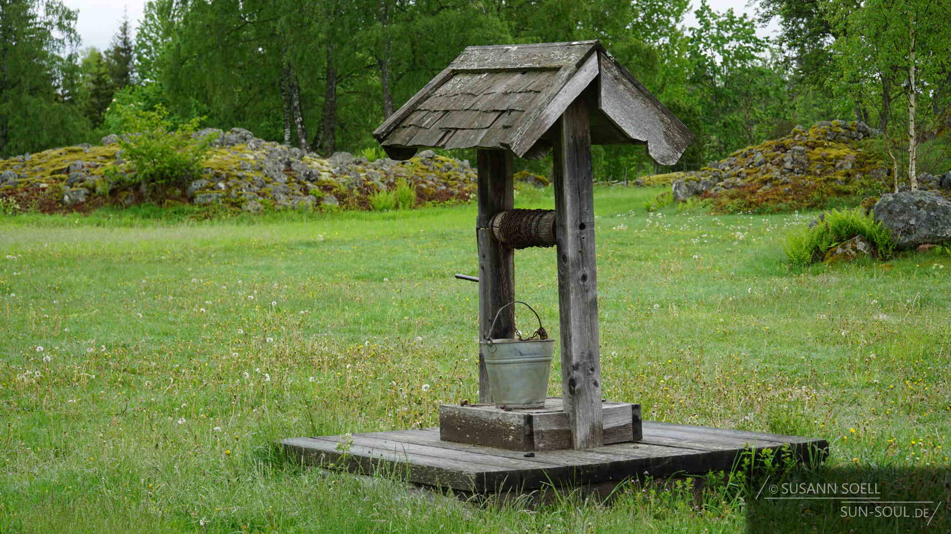 Wir fahren als erstes direkt auf die E4 Richtung Jönköping und folgen ihr bis zur Ausfahrt Huksvarna. Ab da nehmen wir die 132 und biegen in Lekeryd links zum Kulturreservat Åsens by ab, unserem ersten Stopp (Åsen 1, 578 92 Aneby – Web). Auf einem großzügigen Parkplatz lassen wir Leo stehen und gehen durch ein kleines, altes Holztor, welches uns im Kulturreservat willkommen heißt. Wir schreiten einen kleinen Naturpfad hinauf und merken schnell, wie wir heute erneut eine kleine Zeitreise unternehmen. Wiesen mit Schilf säumen den Anstieg, ein kleiner Bachlauf plätschert vor sich hin, der Weidezaun droht dem Wetter jeden Moment nachzugeben und die Begrenzungssteine sind bereits mit Moos überwuchert.