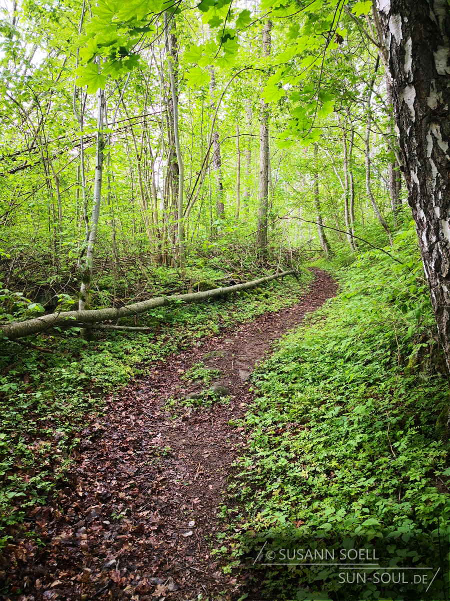 Von der Mühle aus gehen wir den Weg am Fluss noch ein Stück weiter bis ein kleiner Waldweg links abzweigt und uns bergauf führt. Wir befinden uns mitten im Naturreservat Västanå. Uns umgeben meterhohe Laub- und Nadelbäume, die teilweise umgestürzt herumliegen und genau wie die kriechenden Weinbergschnecken hier und da unseren Weg kreuzen.