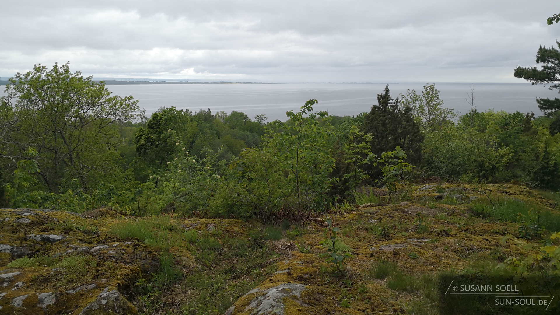 Der Regen des heutigen, aber auch der vergangenen Tage macht den moosbedeckten Weg zu einer überraschenden Rutschbahn und bringt uns mächtig ins Schwitzen. Doch die Anstrengung wird belohnt. Oben angekommen, werden wir mit einem traumhaften Ausblick auf den See Vättern belohnt. Trotz des wolkenverhangenen Himmels reicht die Sicht bis hinüber ans andere Seeufer.