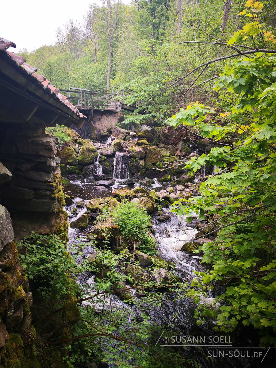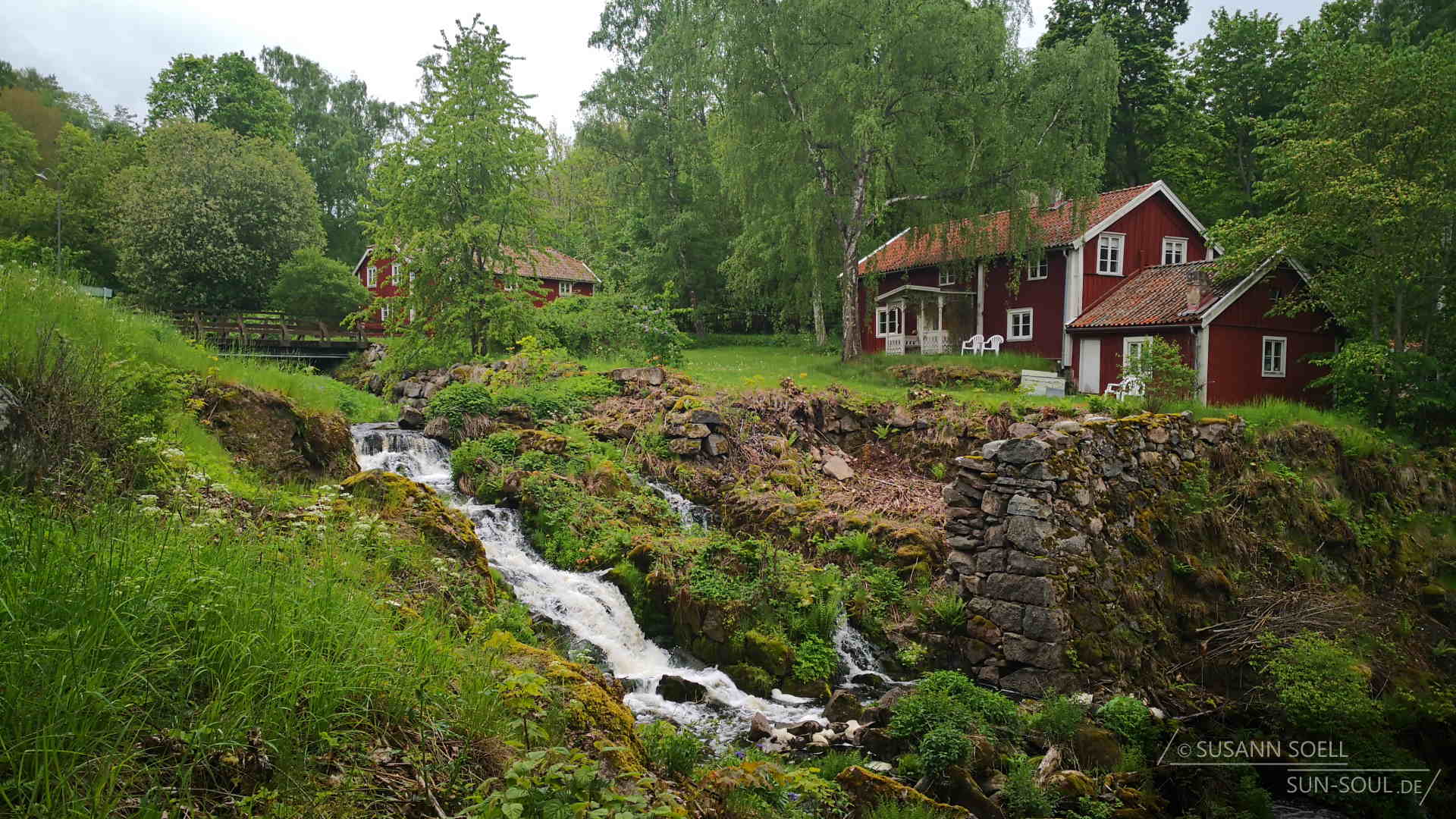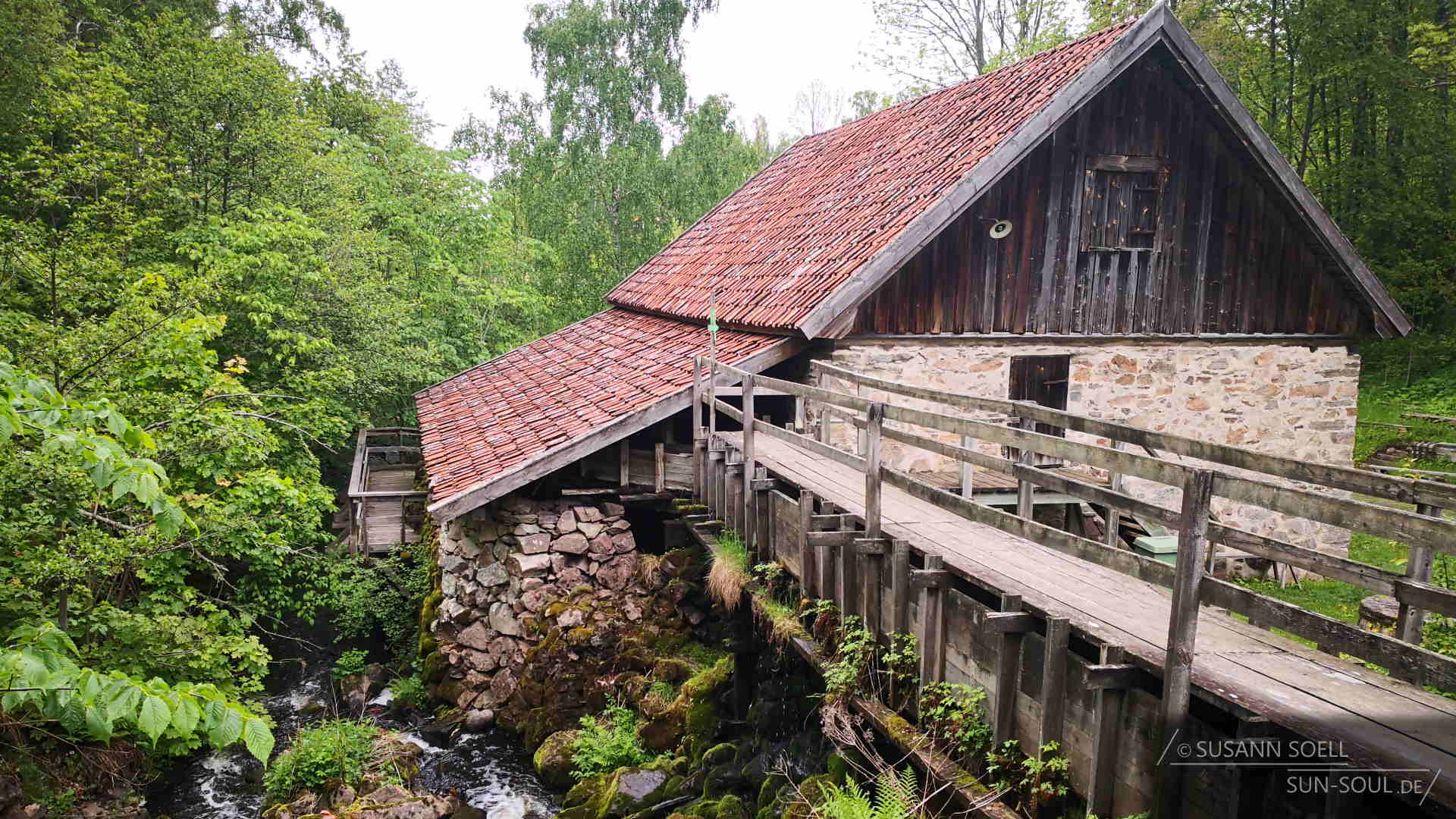 Wir folgen dem Flusslauf, lassen uns zwischendurch immer wieder von den am Wegesrand duftenden Fliederbüschen verzücken und erreichen schließlich Rasmus Kvarn. Die alte Mühle wurde in den Jahren 1976-1977 renoviert und in ihren ursprünglichen Zustand zurückversetzt.[2] Über einen Steg kann man sozusagen durch die Mühle hindurchlaufen und die drei Wasserräder anschauen. Auf der anderen Seite führt eine kleine Brücke über den Fluss, von der wir auf den Wasserlauf der Röttle sehen können.