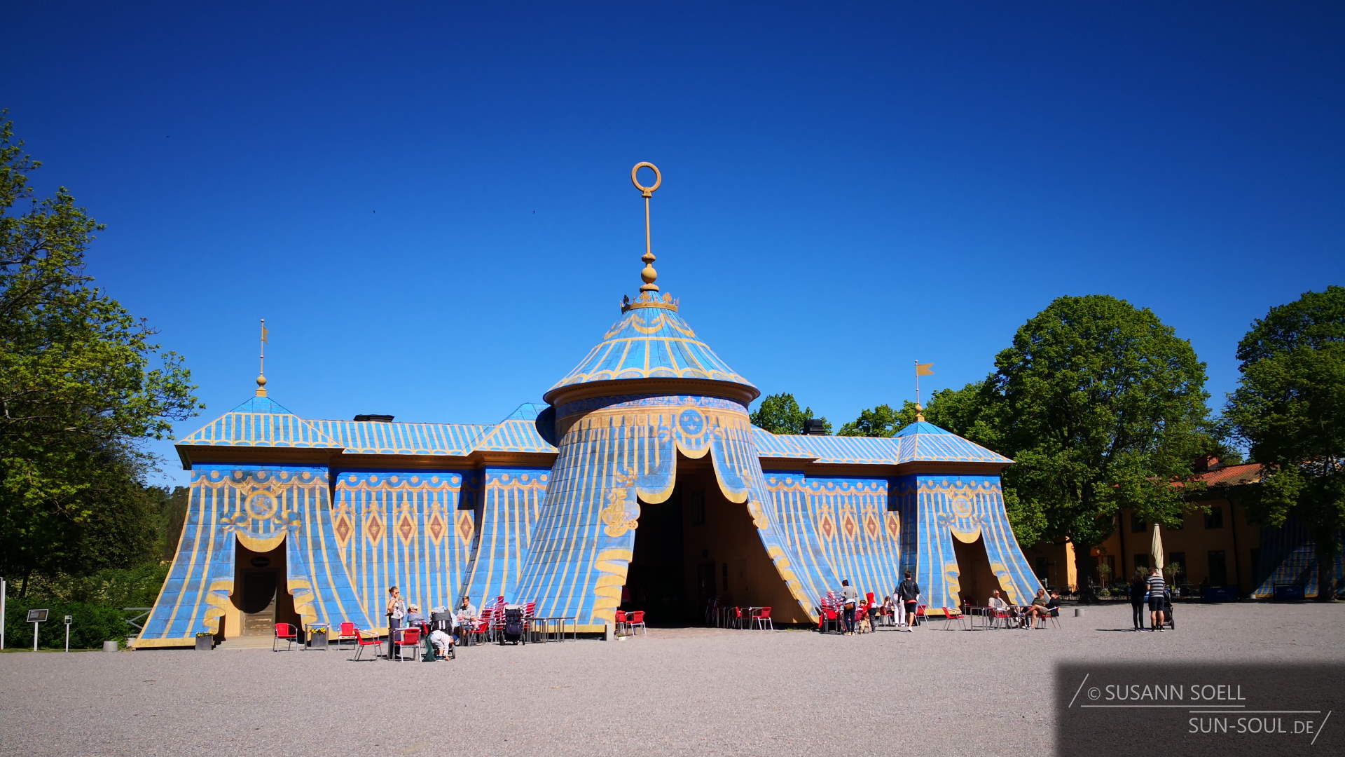Nur knapp 500 Meter weiter südlich gelangen wir zu einer weiteren Hagaparken-Sehenswürdigkeit, den Värdshuset Koppartälten (Kupferzelte). Ein bisschen orientalisch wirken die drei Zelte auf uns. Sie stammen vom Architekten Louis Jean Desprez, der sie römischen Militärzelten nachempfunden hat. Früher dienten sie als Ställe, heute sind ein Café, ein Restaurant und das Parkmuseum darin untergebracht.[4]