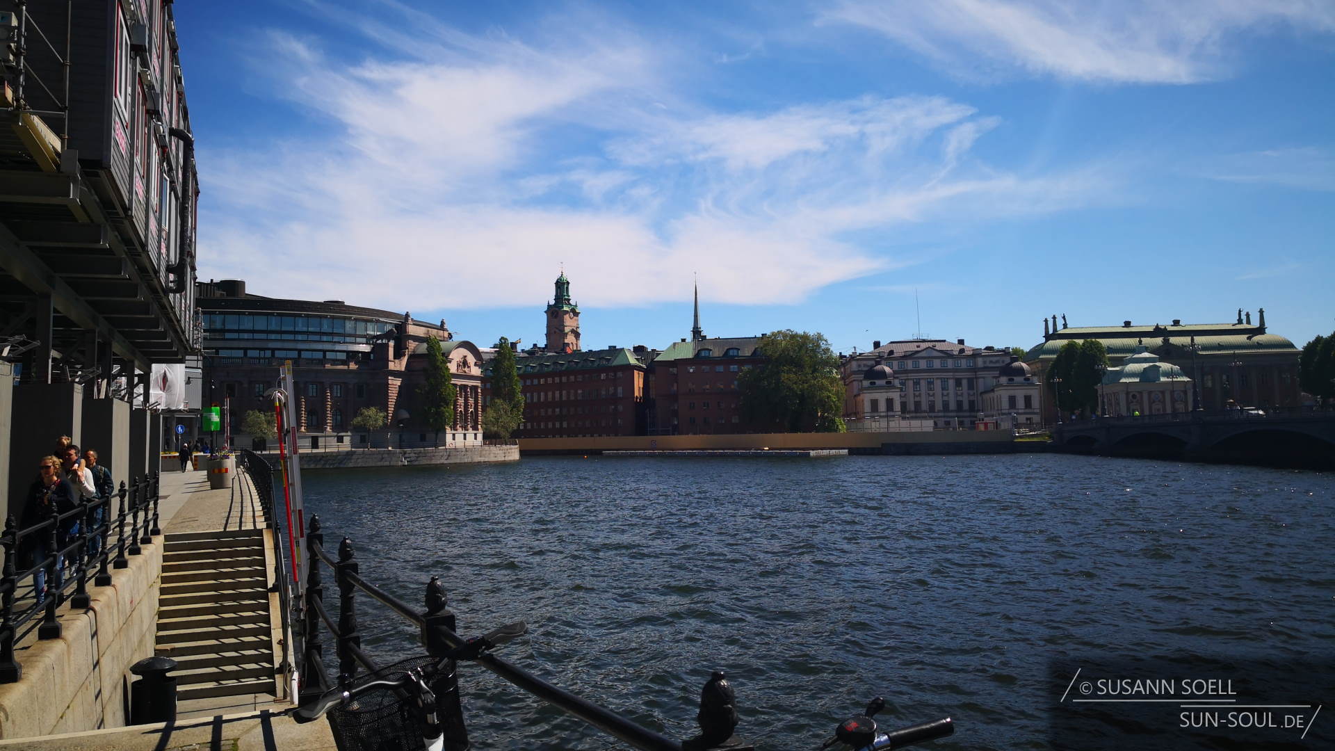 Norrmalm ist neben Kungsholmen und Östermalm einer von drei Stadtteilen, die laut Reiseführer das moderne Stockholm darstellen.[7] Wir laufen in Richtung Wasser zur Vasabron. Von dort schauen wir auf die gegenüberliegende Seite und erblicken links auf der winzigen Insel Helgeandsholmen das Riksdagshuset (Reichtagsgebäude) sowie in der Gamla Stan (Altstadt) das Riddarhuset (Ritterhaus) und das Bondeska palatset (Bondesches Palais):